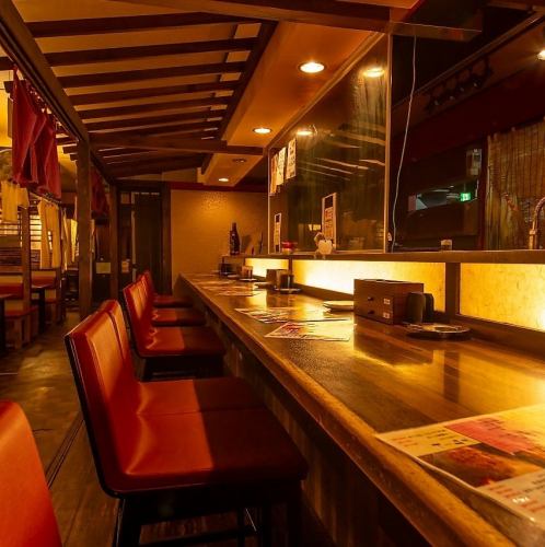 【デート向きのカウンター席】ゆったりと過ごせるカウンター席は、お二人だけの特別な時間を演出します。暖かみのある照明が落ち着いた雰囲気を醸し出しています。仕切りのついた半個室席もご用意しております◎